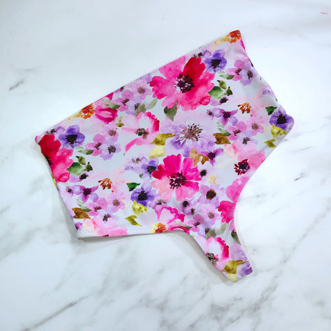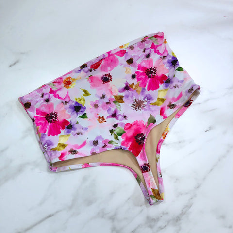 High waist over the navel floral print swimsuit bottom. Thong cut.