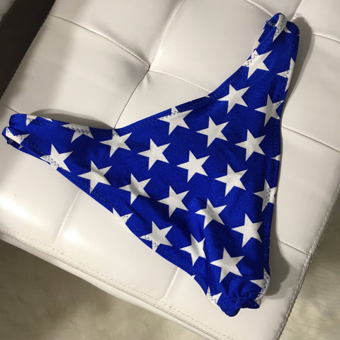 Women's high leg cheeky bikini bottom. Fully lined. Royal blue and white stars. High hip cut. Mix and match these bottoms with so many different style tops, the possibilities are endless!